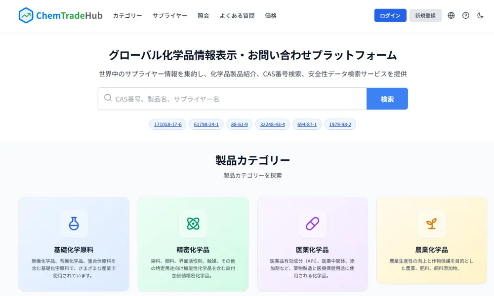 さらに、ChemTradeHub は CAS番号による精密検索 に対応しており、ユーザーは必要な化学品を迅速に見つけることが可能です。多言語対応(中国語・日本語・英語)により、国際ビジネスニーズに応え、多言語・国際化 の情報表示体験を提供します。