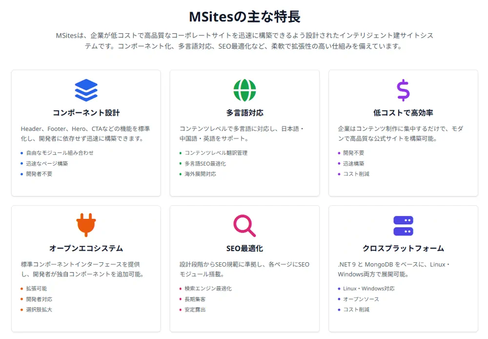 当社が独自に開発した MSites スマート建站システムが正式に公開されました。多言語対応、コンポーネント設計、SEO最適化により、企業の公式サイト構築を支援します。